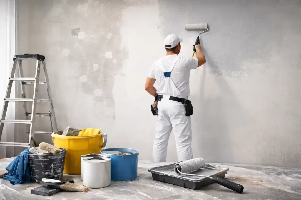 A professional painter using a roller to coat an interior wall. This step comes after meticulous surface preparation (cleaning, sanding and patching) to ensure a smooth, long-lasting finish.